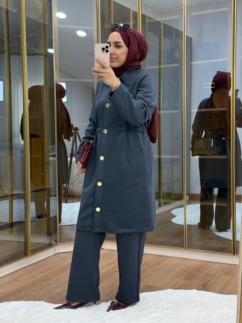Gold Düğmeli Beli büzgülü Scuba Takım Füme