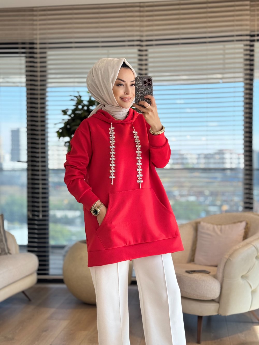 HWN9021 Parla Kanguru Cepli Sweat Kırmızı
