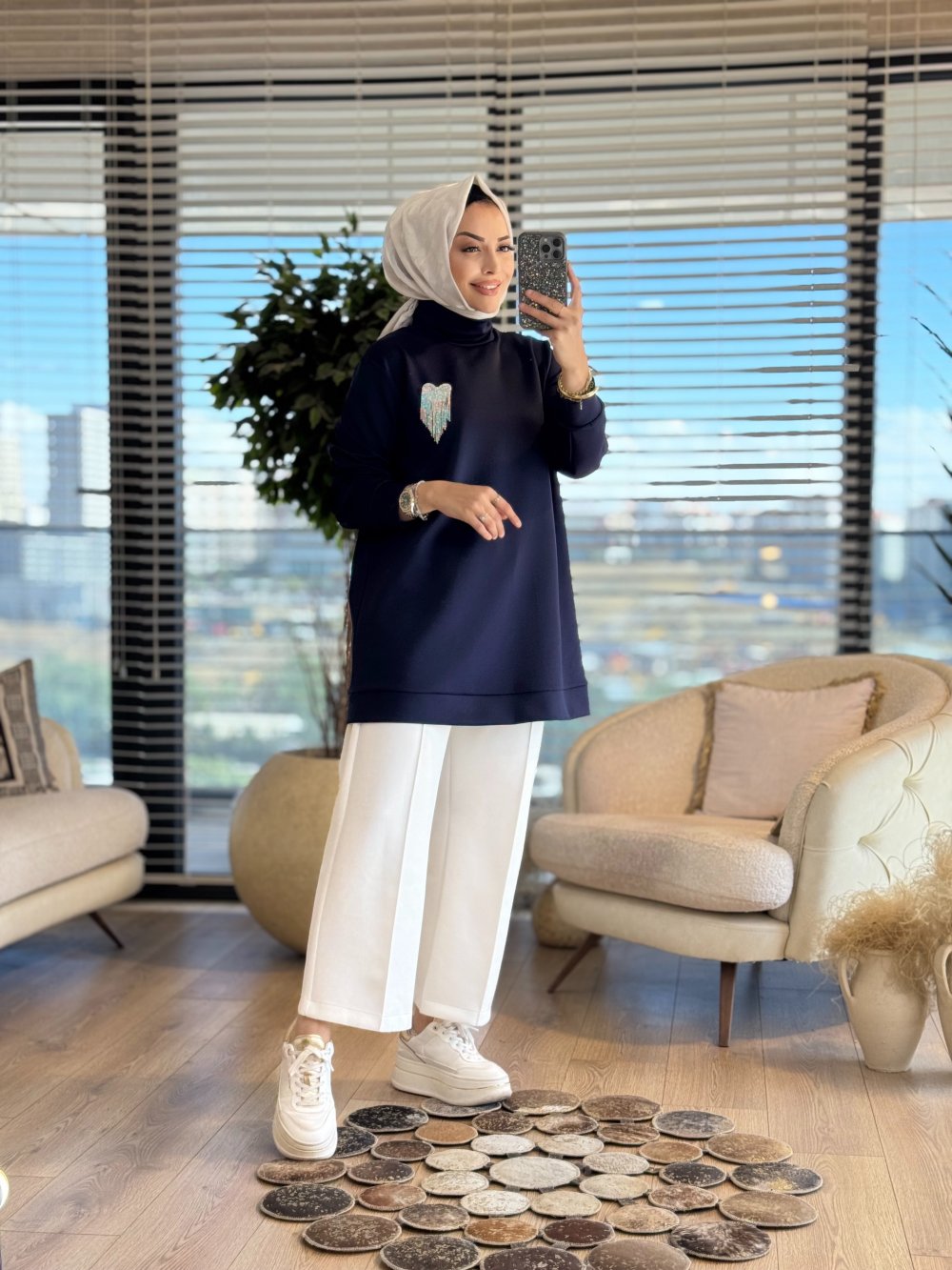 HWN9025 Kalp Broşlu Scuba Sweat Lacivert