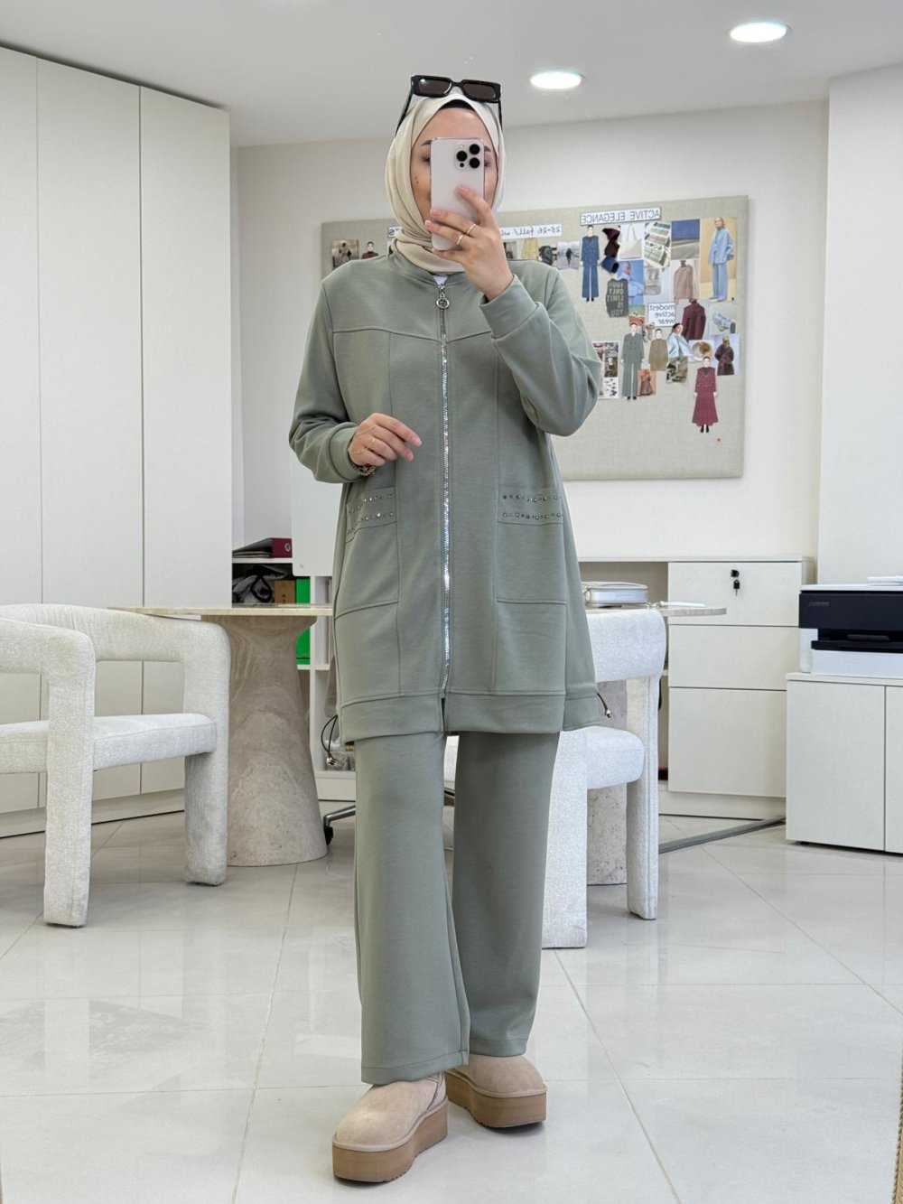 Tunik boy 85 cm’dir. Önünde metal dişli fermuarı ve yanlarda taşlı cepleri mevcuttur.