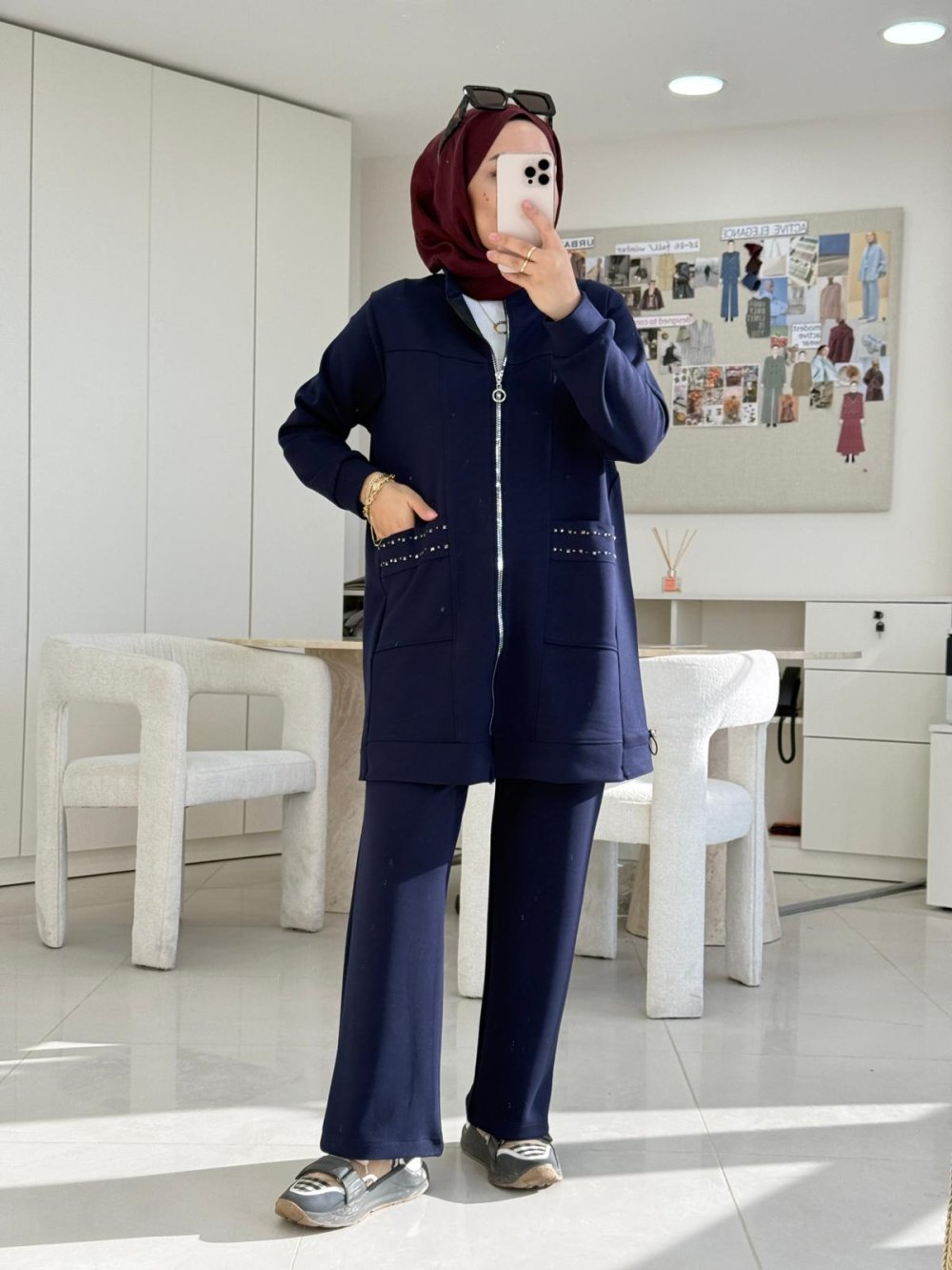 Tunik boy 85 cm’dir. Önünde metal dişli fermuarı ve yanlarda taşlı cepleri mevcuttur.