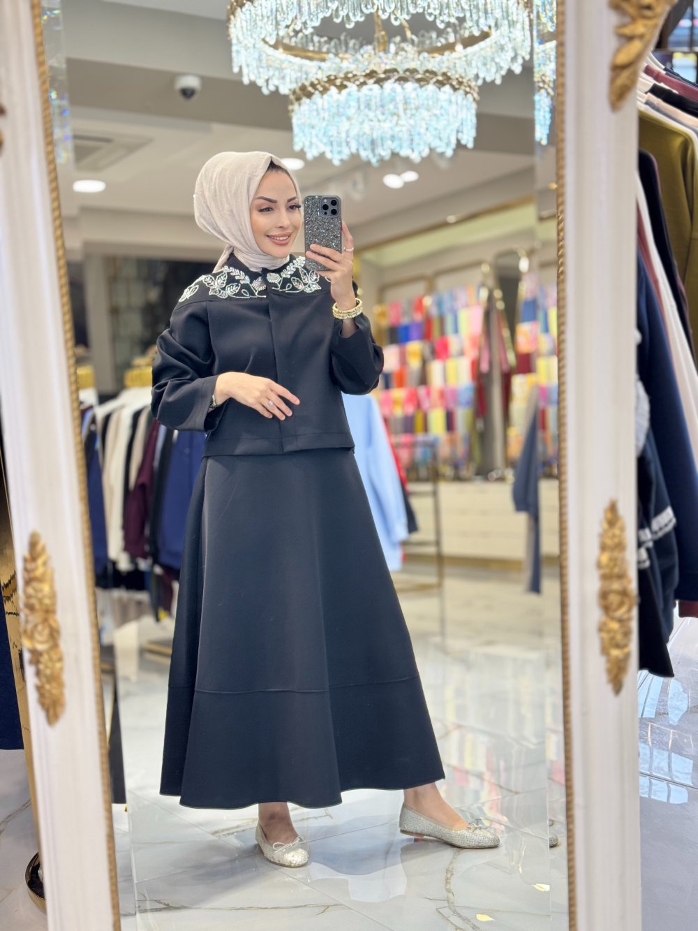 K6007 Omuzları Boncuk İşlemeli Etekli Takım Siyah
