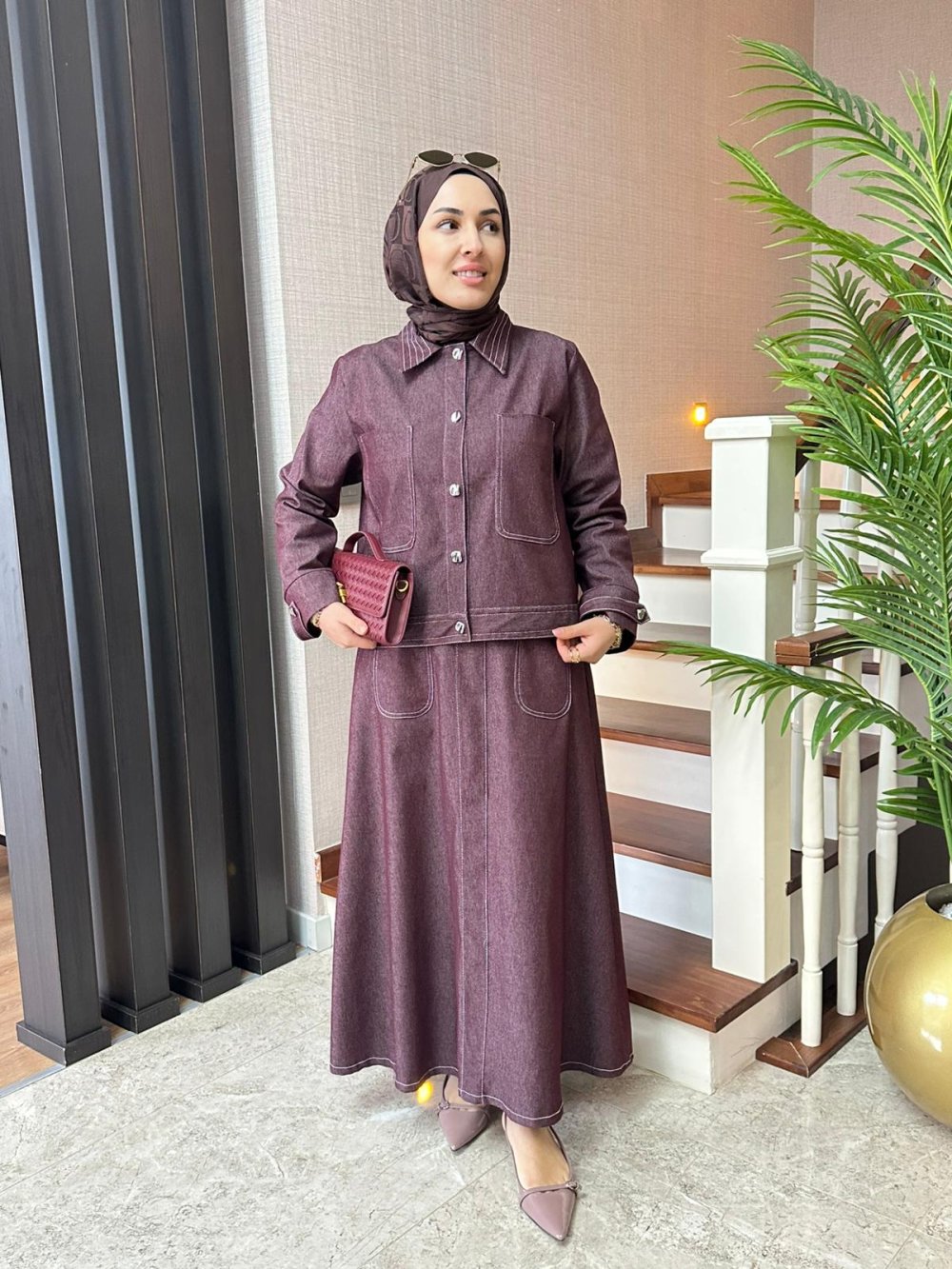 Kontrast Dikişli Kot Etekli Takım Bordo