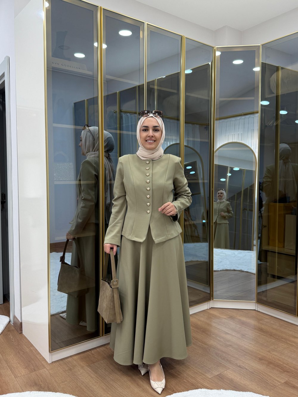 Kulp Detaylı Astarlı Etekli Takım Haki