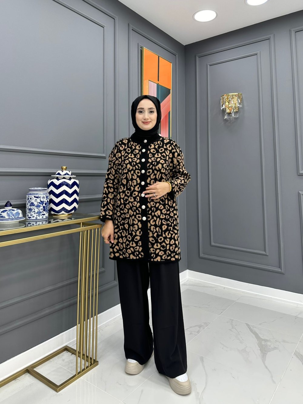 Leopar Desenli Hırka - Siyah