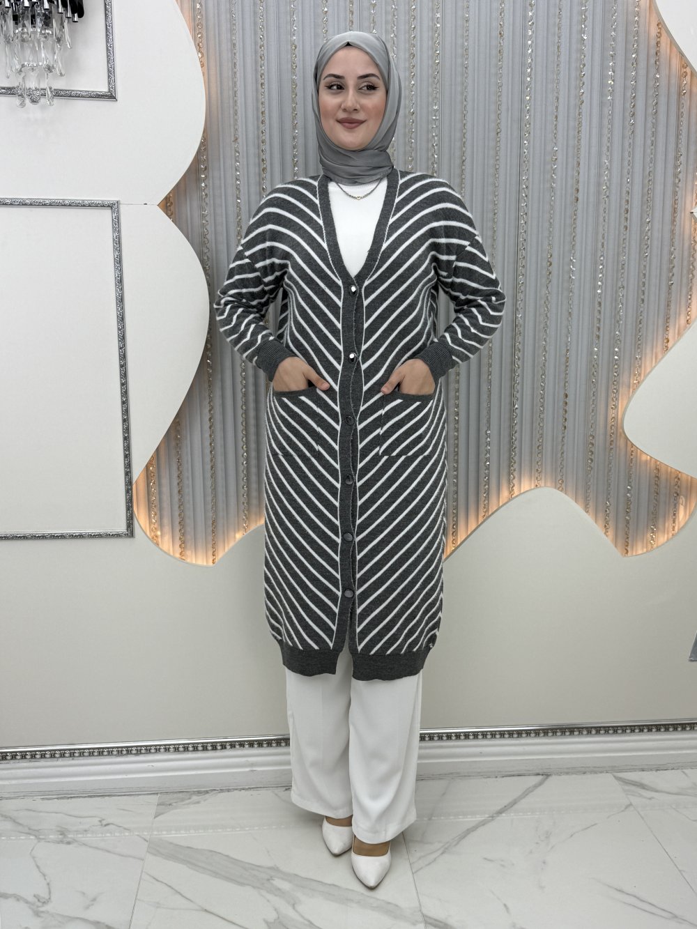Mehlika Çizgili Hırka Gri