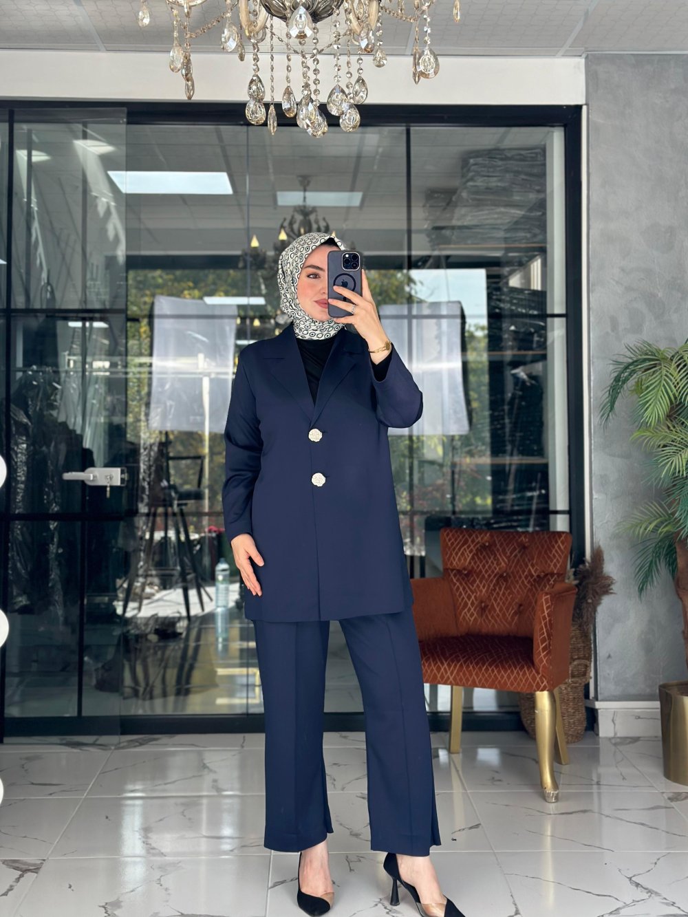 Kumaşı scuba kreptir. Önü düğmelidir. Pantolon beli lastiklidir. Rahat kalıptır.