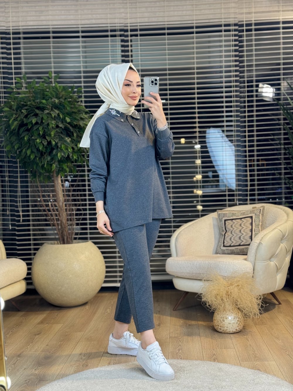 MRW1169 Yaka Taş İşlemeli Takım Antrasit