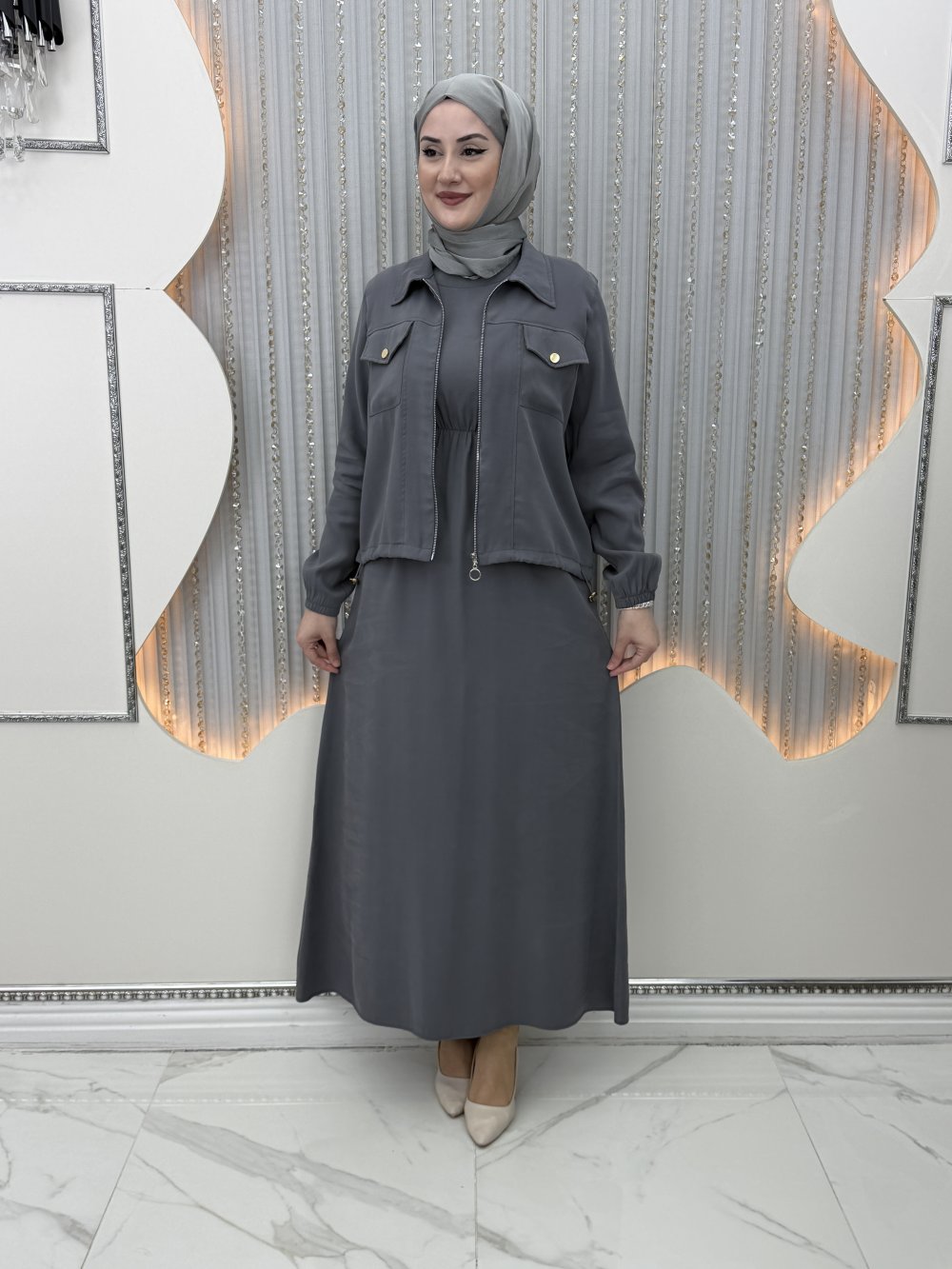 Nursena Elbiseli Hırka Gri