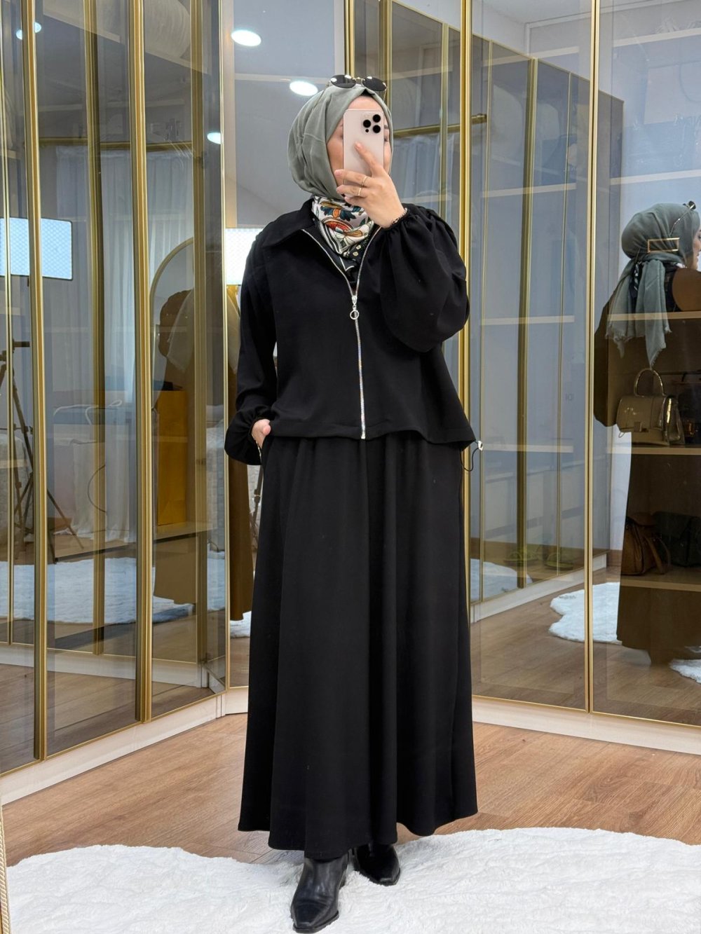 Omuzu Büzgülü Ceket Etek Takım Siyah