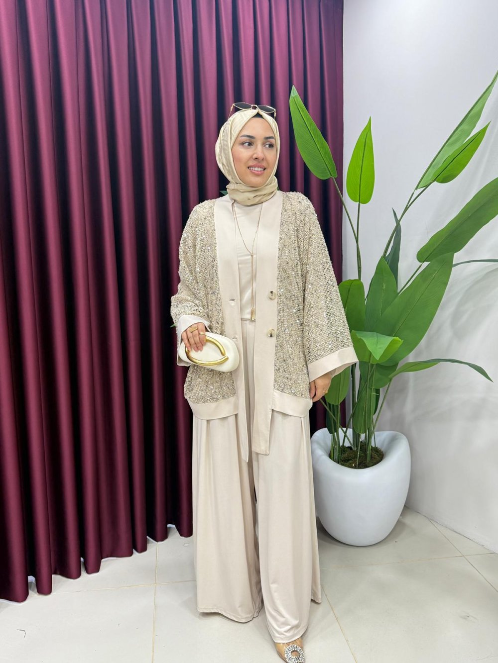Payetli Üçlü Takım Bej