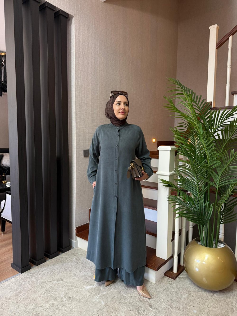 Tunik boy 125 cm’dir. Önden düğmeli, yanında cepleri ve yırtmaçları mevcuttur.