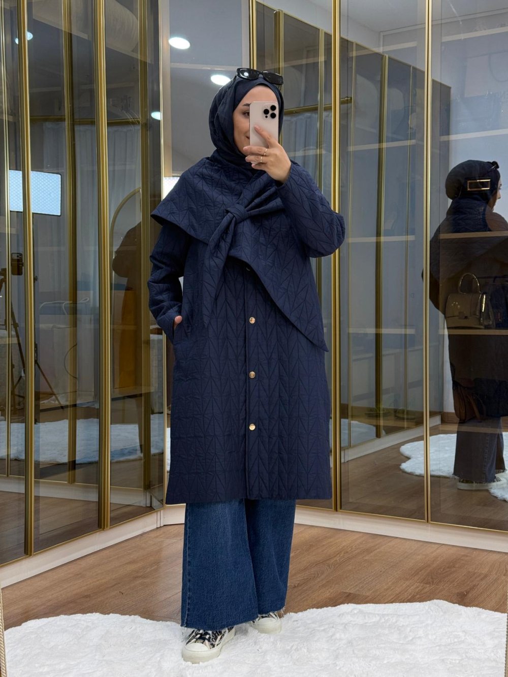 Şal Detaylı Kapitone Mont Lacivert