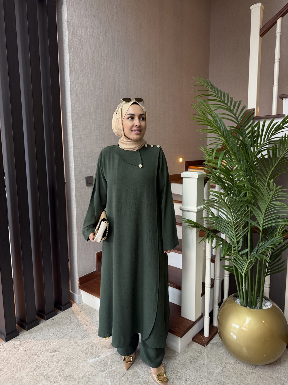 Tunik boy 125 cm’dir. Kruvaze kapama şeklinde gelmektedir, omuzunda düğme detayları mevcuttur.