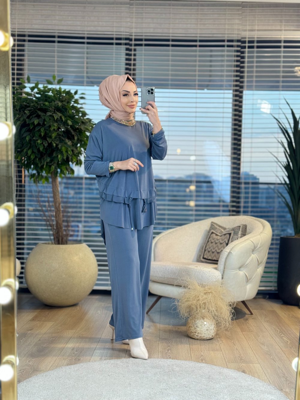 W5960 Önden Bağlamalı Şifon Garnili Takım Gri