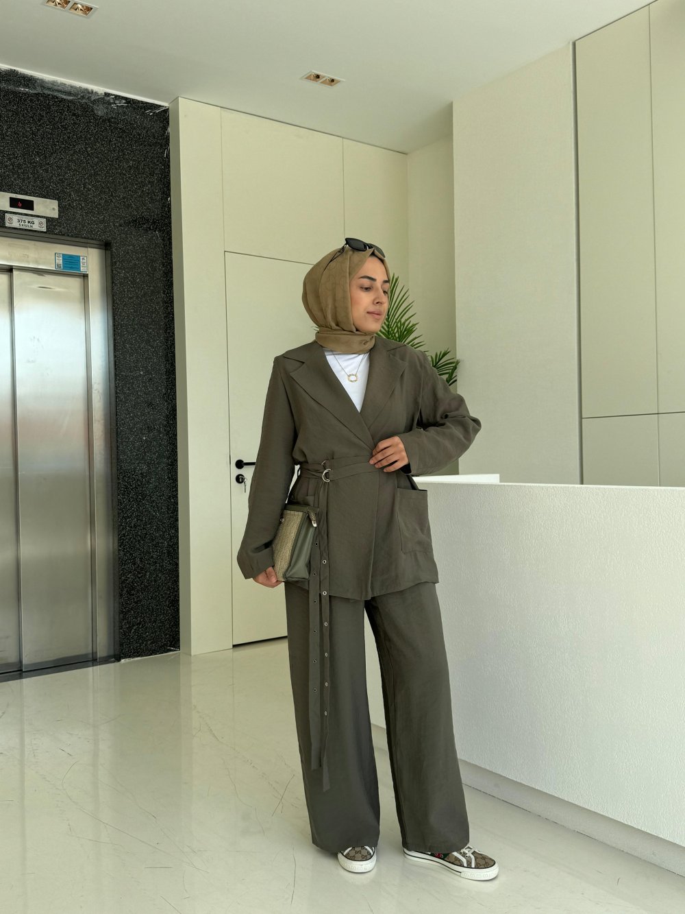Pantalon ön kısmında fermuar ve düğme bulunmaktadır .Arka kısmı lastiklidir.