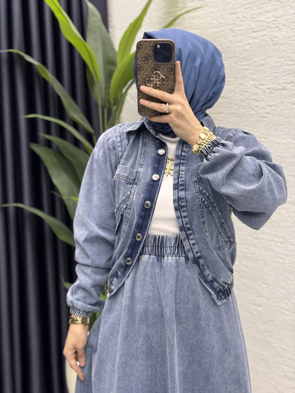 Hem gömlek hem ceket olarak kullanabileceğiniz kot etekli takımımız stokta