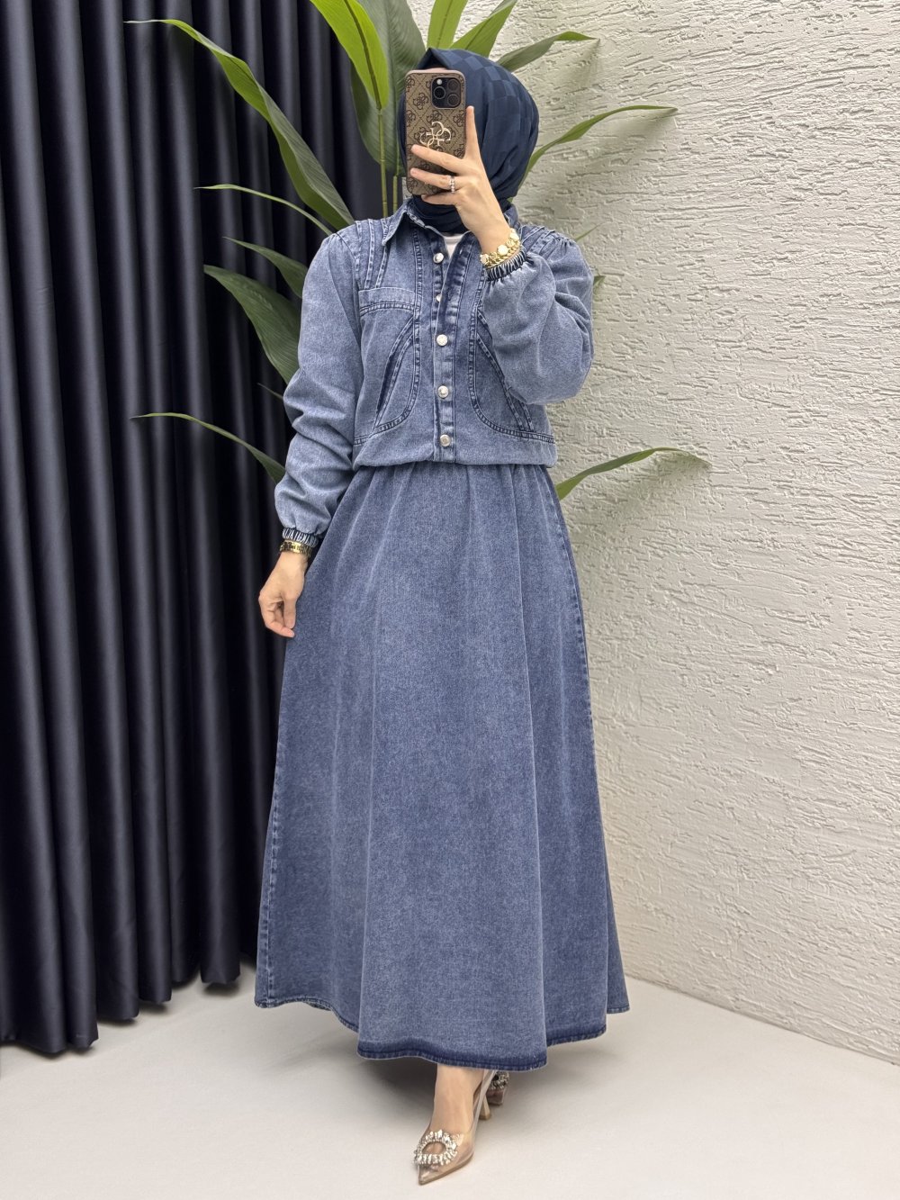 Hem gömlek hem ceket olarak kullanabileceğiniz kot etekli takımımız stokta