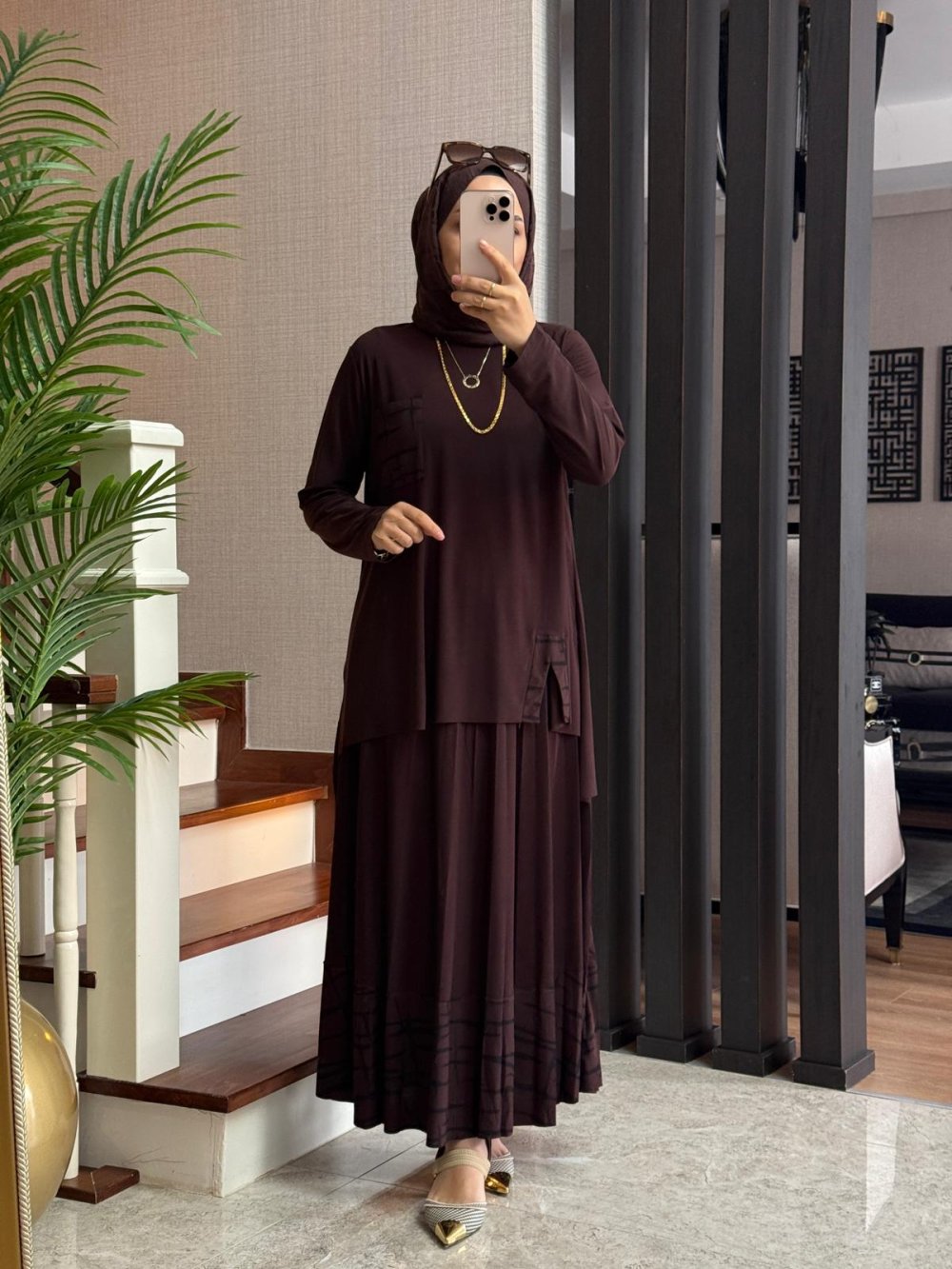 Yırtmaçlı Tilda Etekli Takım Kahverengi